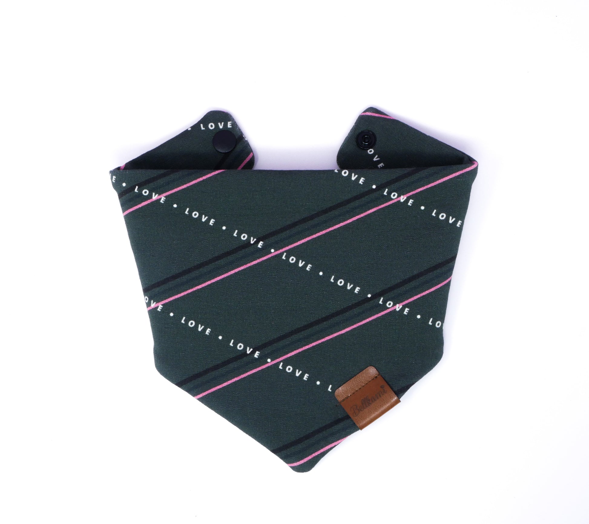 Our bandanas are adjustable in 5 cm intervals, a total of 10 cm and are therefore very practical to adjust. This bandana is made of a comfortable sweat fabric (consisting of 95% organic cotton). It can be worn on both sides and bears our vegan "Bellkami" logo. The snaps ensure easy application.