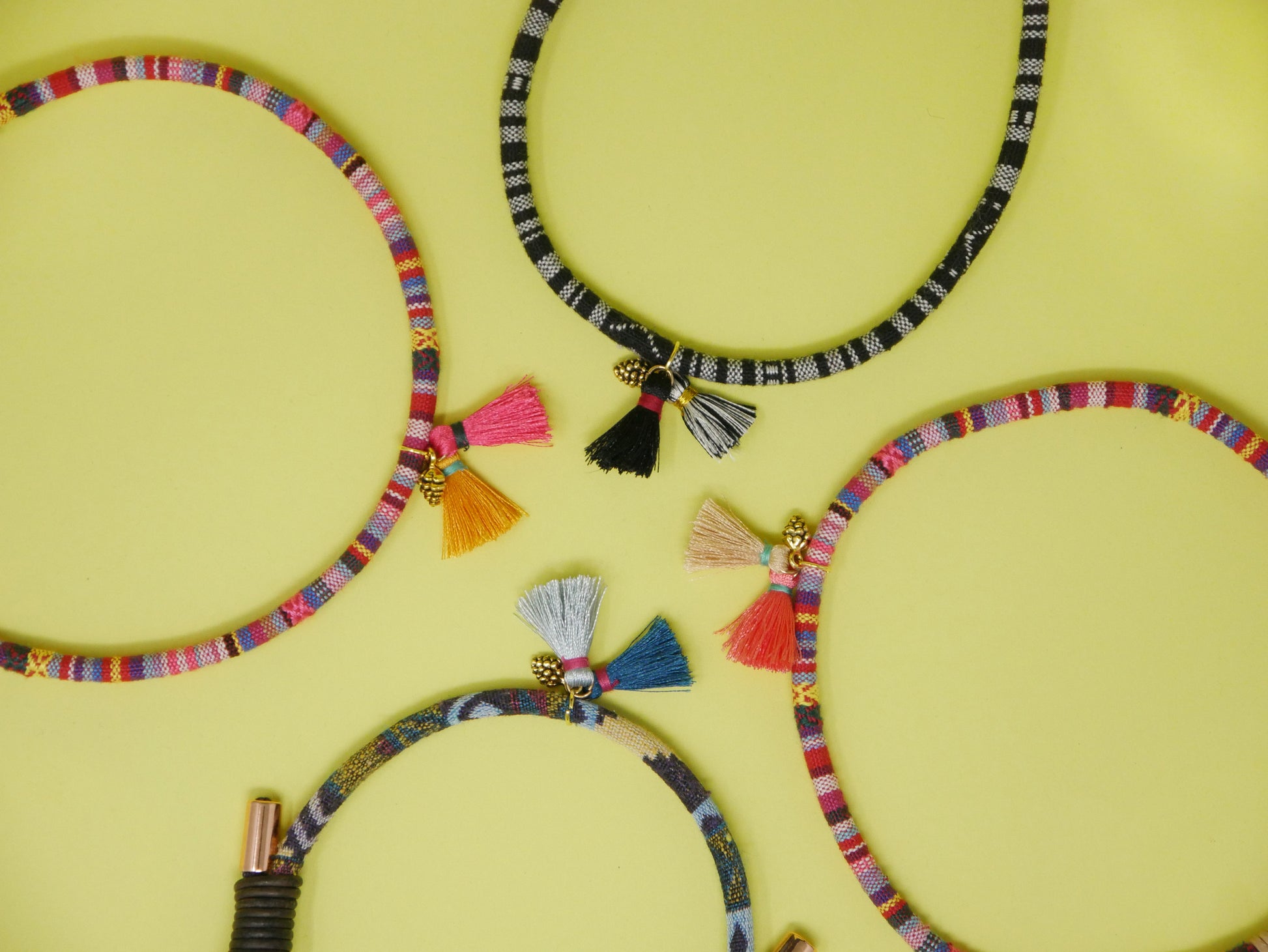 Our Machupichu brand collar from the Essence of Peru collection consists of a colored textile band with a thickness of 6 mm and is decorated with matching tassels.