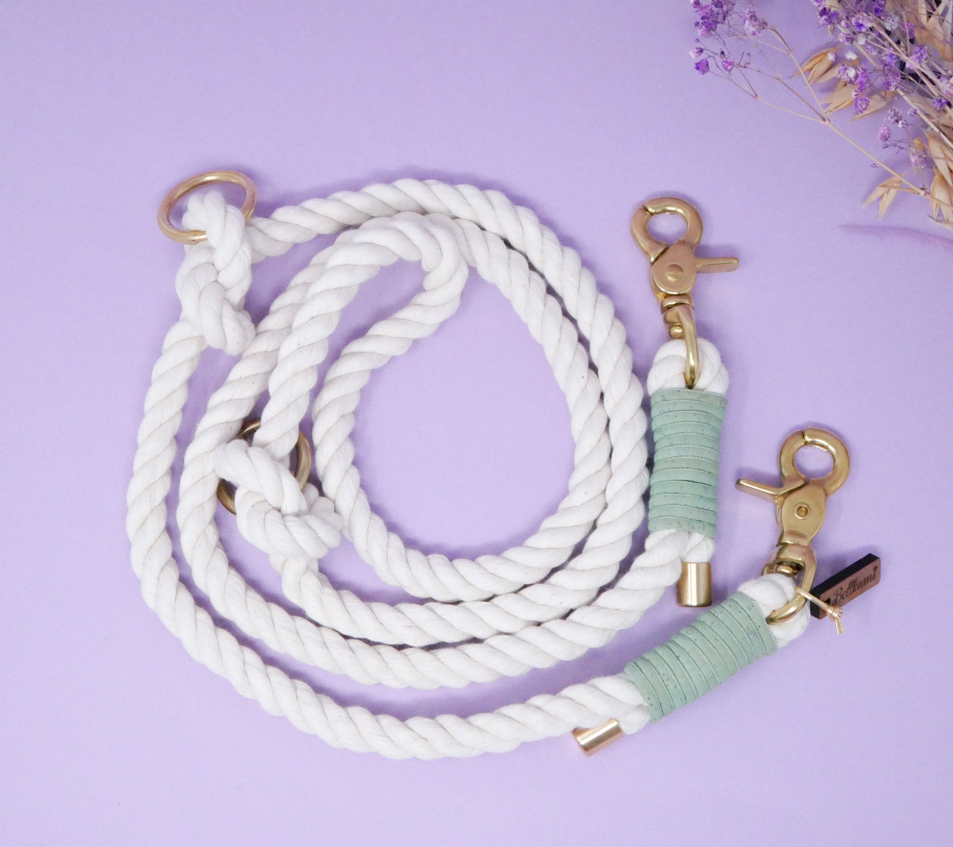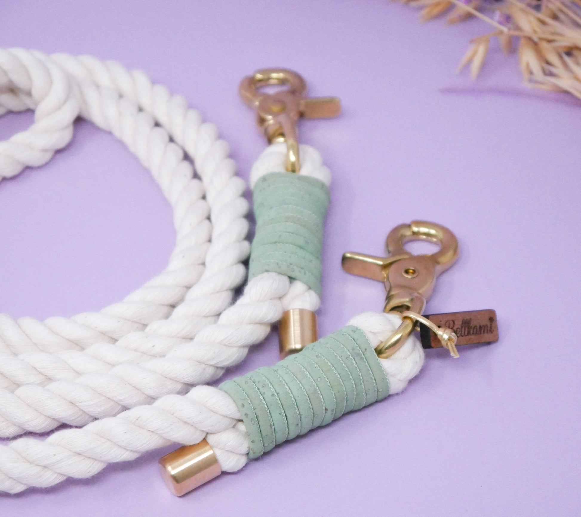 Unsere Atlas Tauleine aus natürlichem Baumwollseil und einer edlen Korktakelung, kannst du wahlweise mit zwei Verstellmöglichkeiten oder mit fester Handschlaufe bestellen. Diese Leine wird mit goldenen Beschlägen ausgestattet und hat eine Stärke von 10 mm.