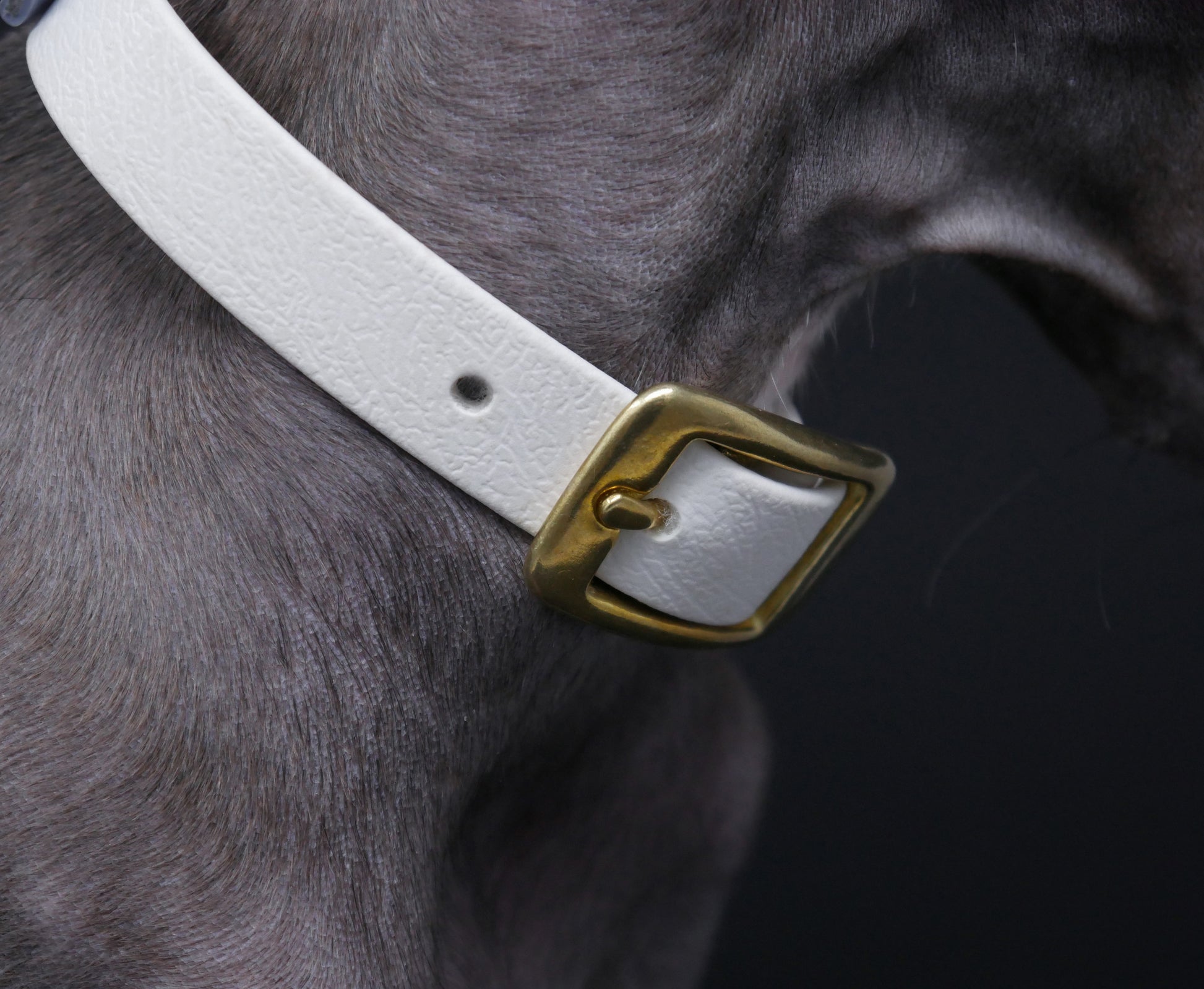 Unser verstellbares Biothane Classy Halsband besteht aus einem wetterfesten und angenehmen Material.