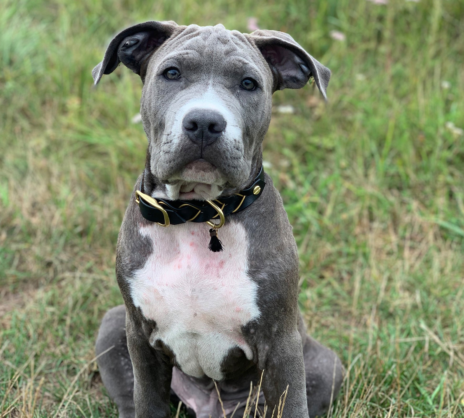 Das Halsband ist auf einer Seite dekorativ geflochten und wird mit einem Dekoband, passend zu den Beschlägen, geziert.