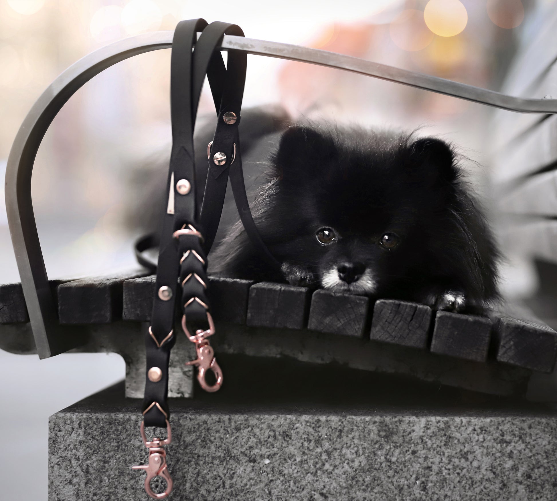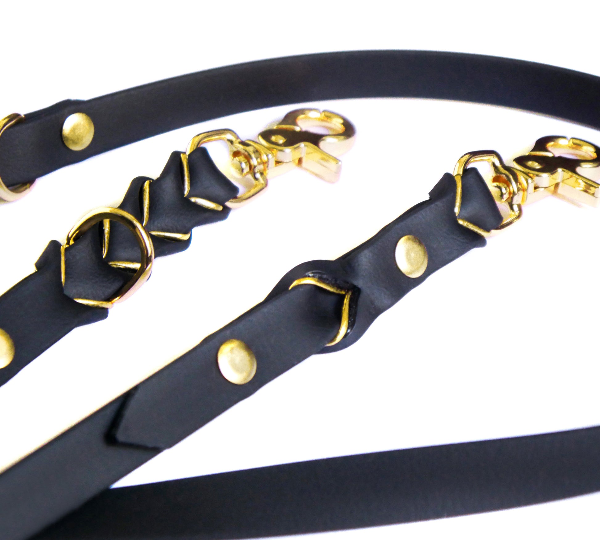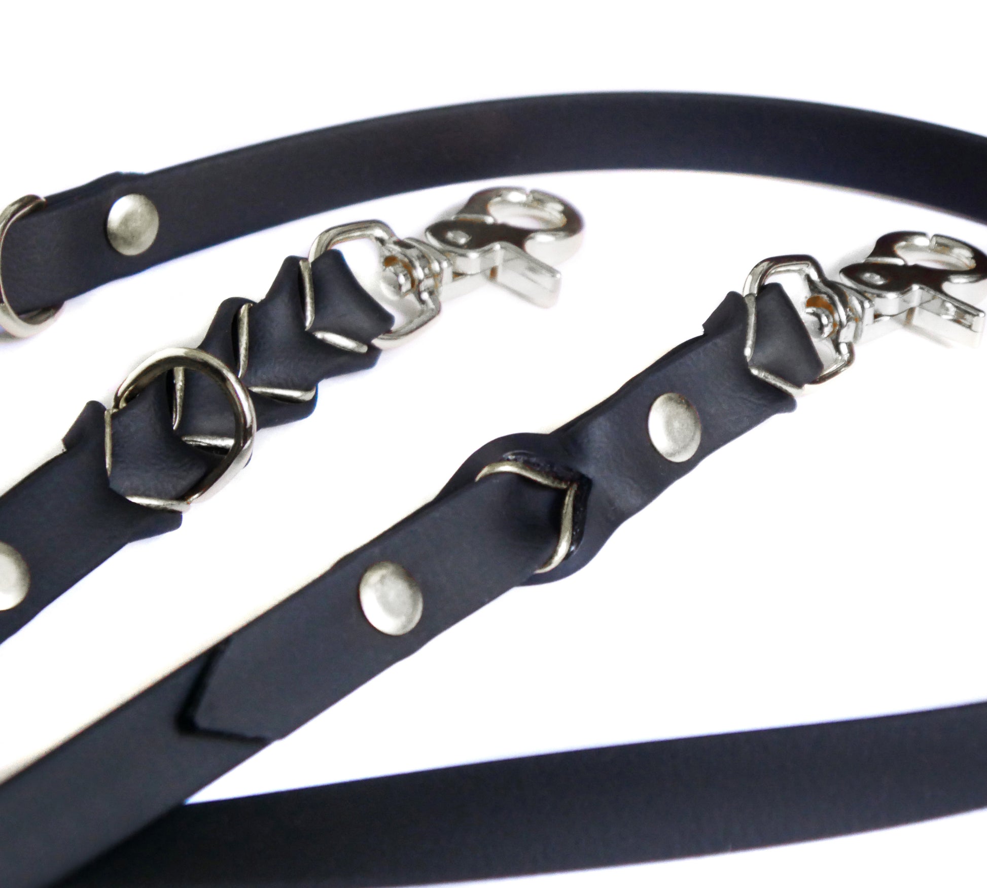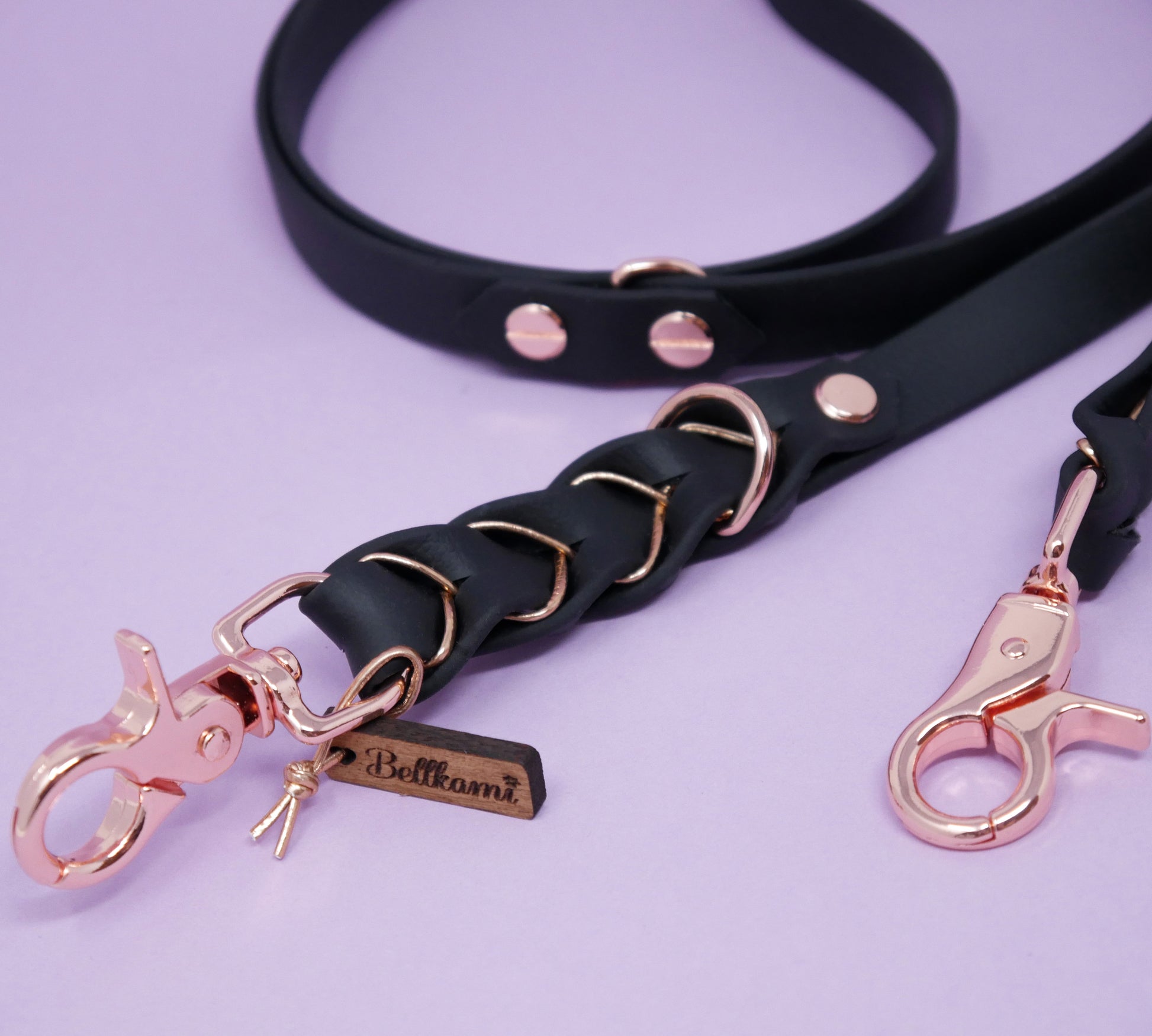 Biothane ist eine gute Alternative zu Leder und ist sehr leicht mit Wasser zu reinigen. Die Beschläge für die Leine können in Roségold, Gold oder Silber gewählt werden.