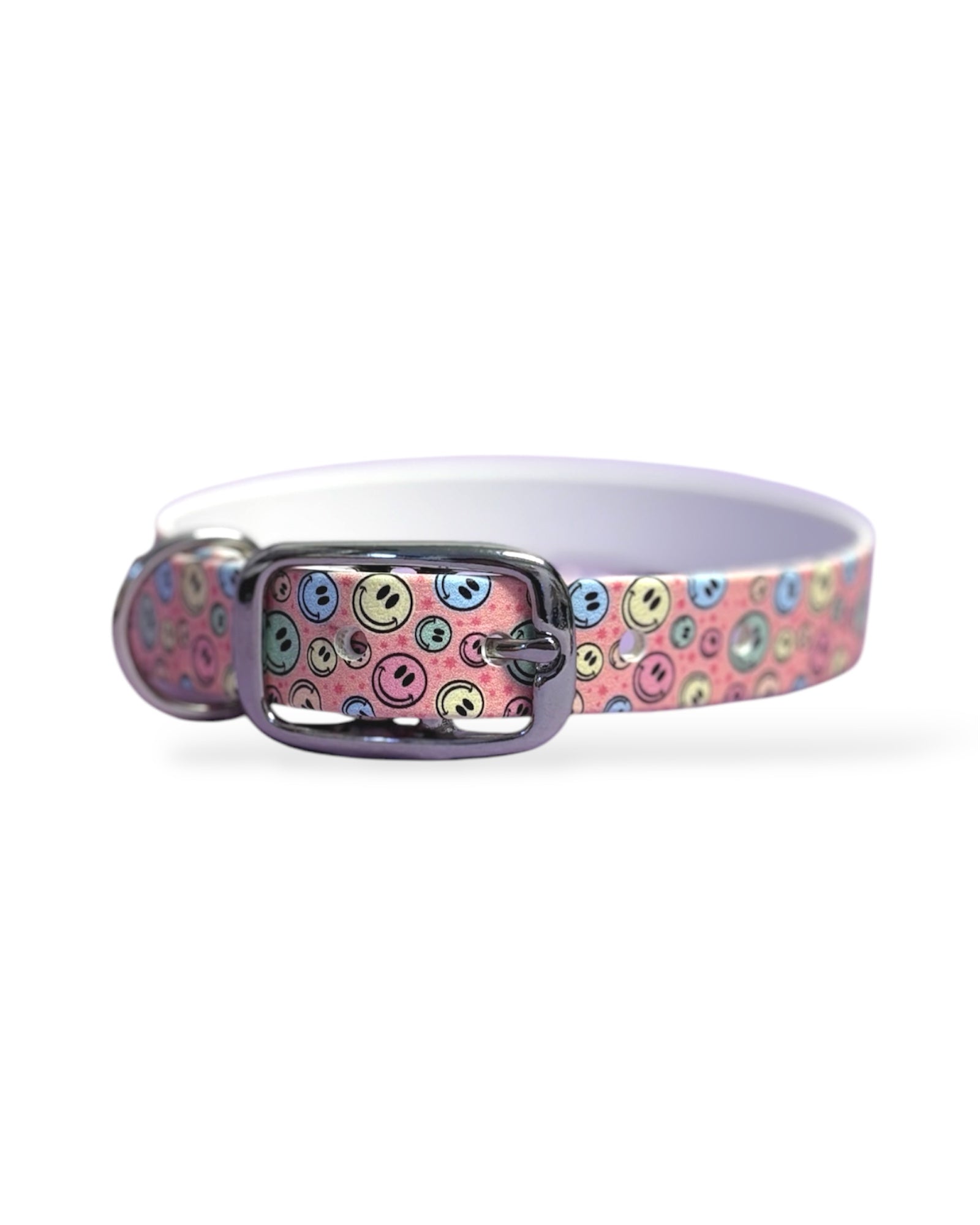 Unser verstellbares Biothane Halsband Happy besteht aus original bedruckter Biothane, einem wetterfesten und angenehmen Material.