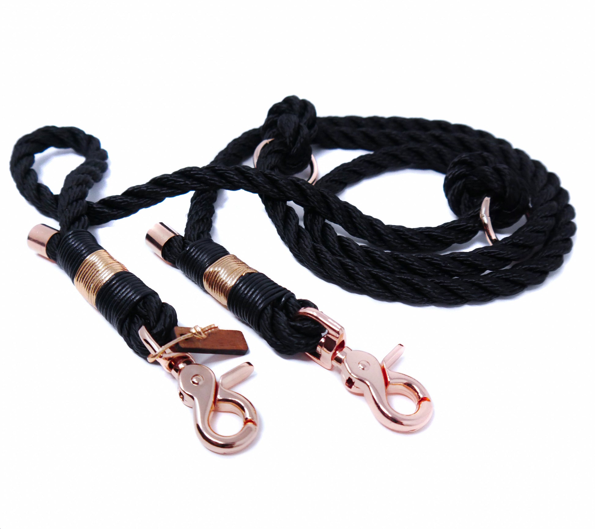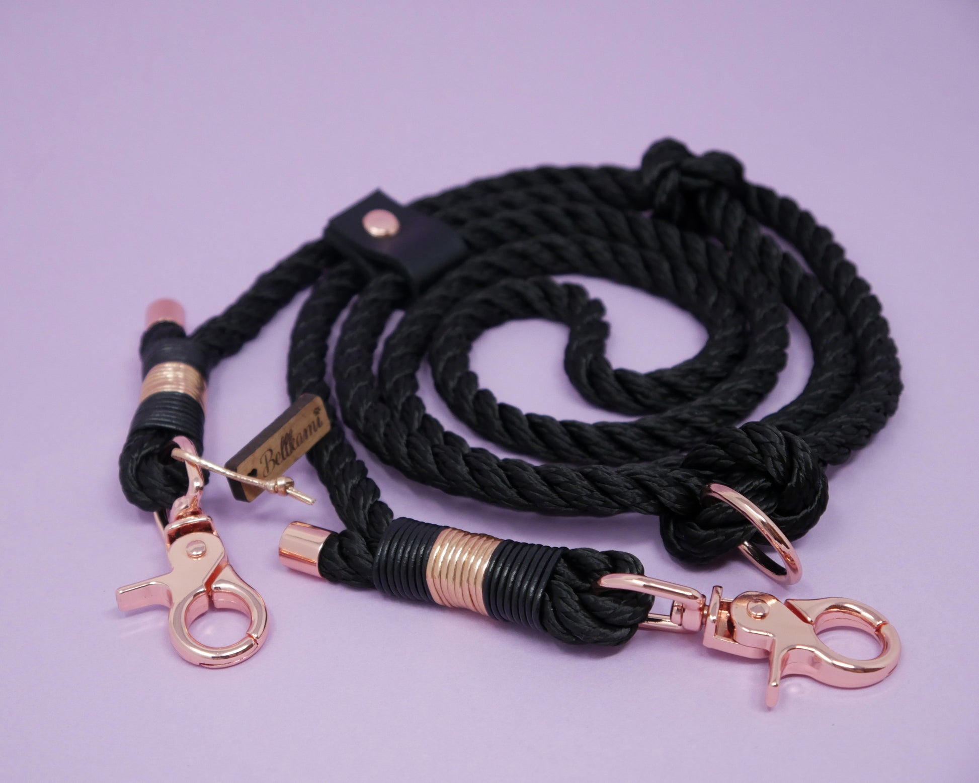 Tauleine aus PPM-Seil (Wetterfest) wahlweise mit zwei Verstellmöglichkeiten oder mit fester Handschlaufe und roségoldenen Karabinern. Die Leine wird von einem zusätzlichen Biothanedetail geziert.
