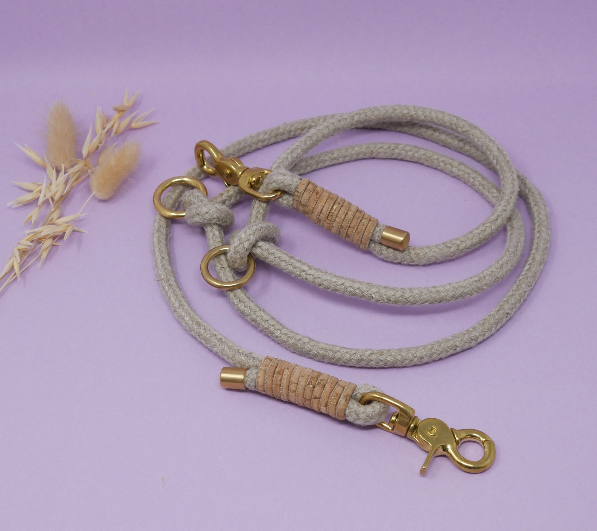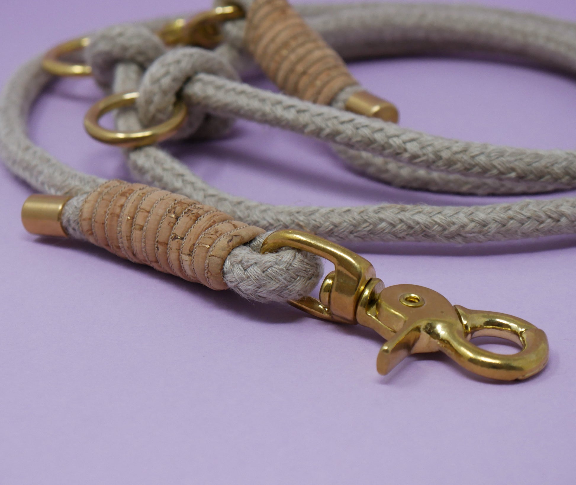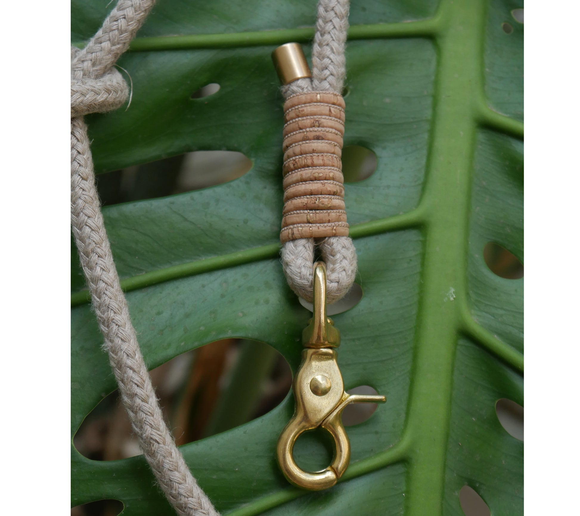 Tauleine aus natürlichem Hanfseil und goldenen Beschlägen. Wahlweise mit zwei Verstellmöglichkeiten oder mit fester Handschlaufe. Die Takelung besteht aus Kork, einem veganem und natürlichem Material.