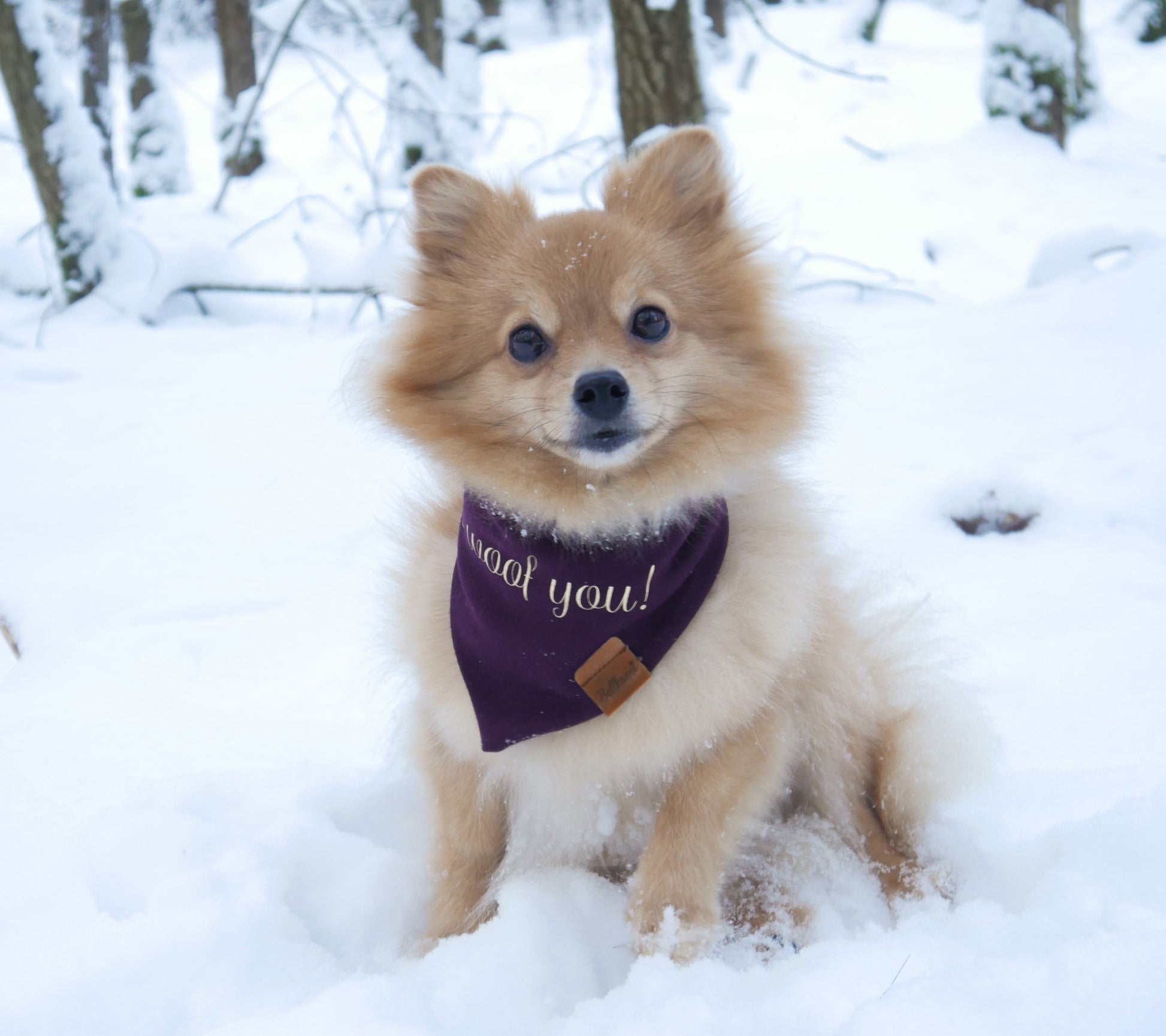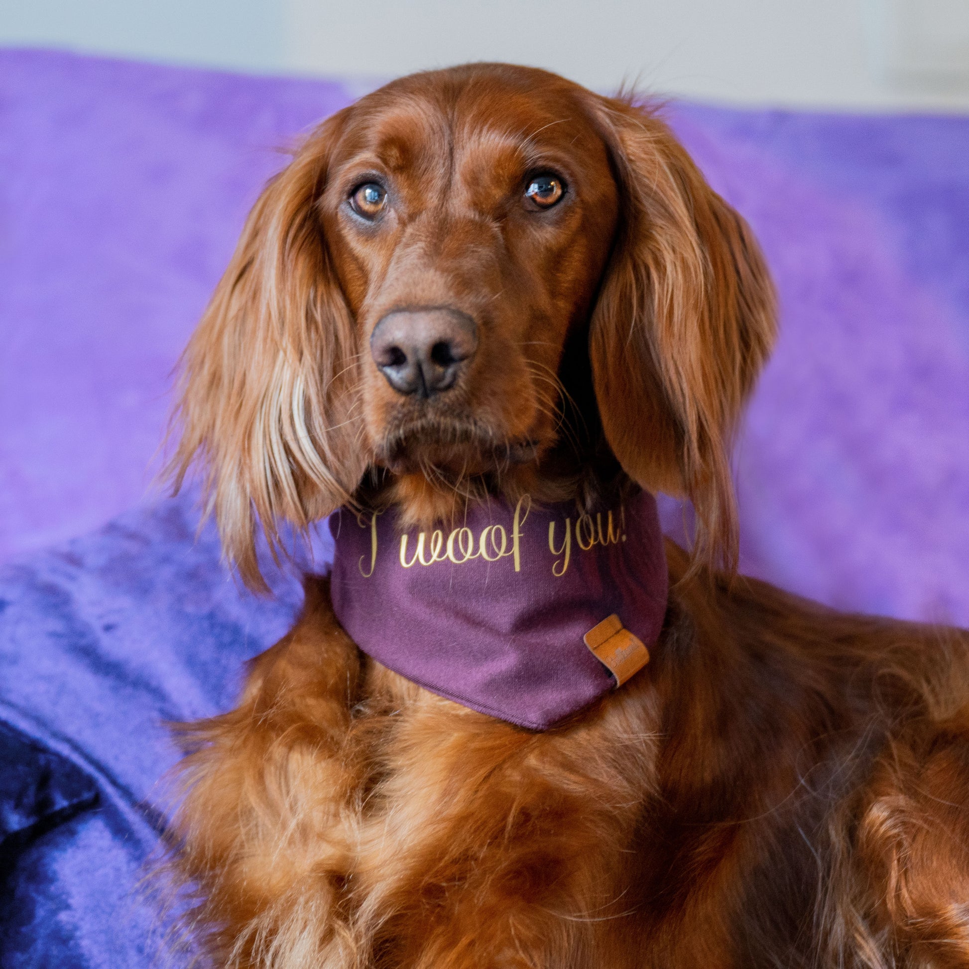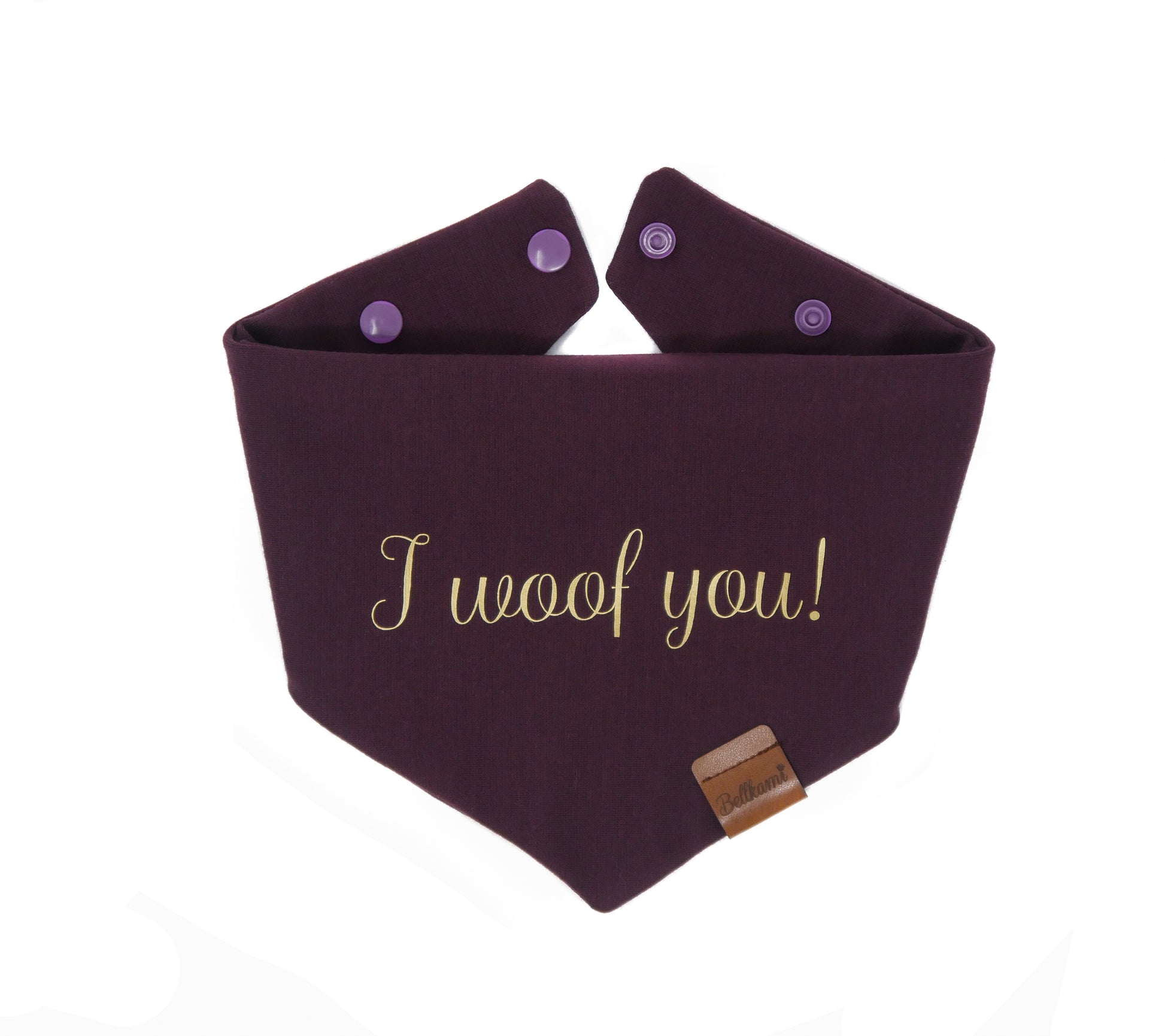 Du möchtest das Bandana, dass du bei uns kaufen möchtest, noch ein wenig veredeln lassen? Das ist möglich! Der Schriftzug "I woof you!" in Gold lässt Hundehalterherzen höher schlagen.