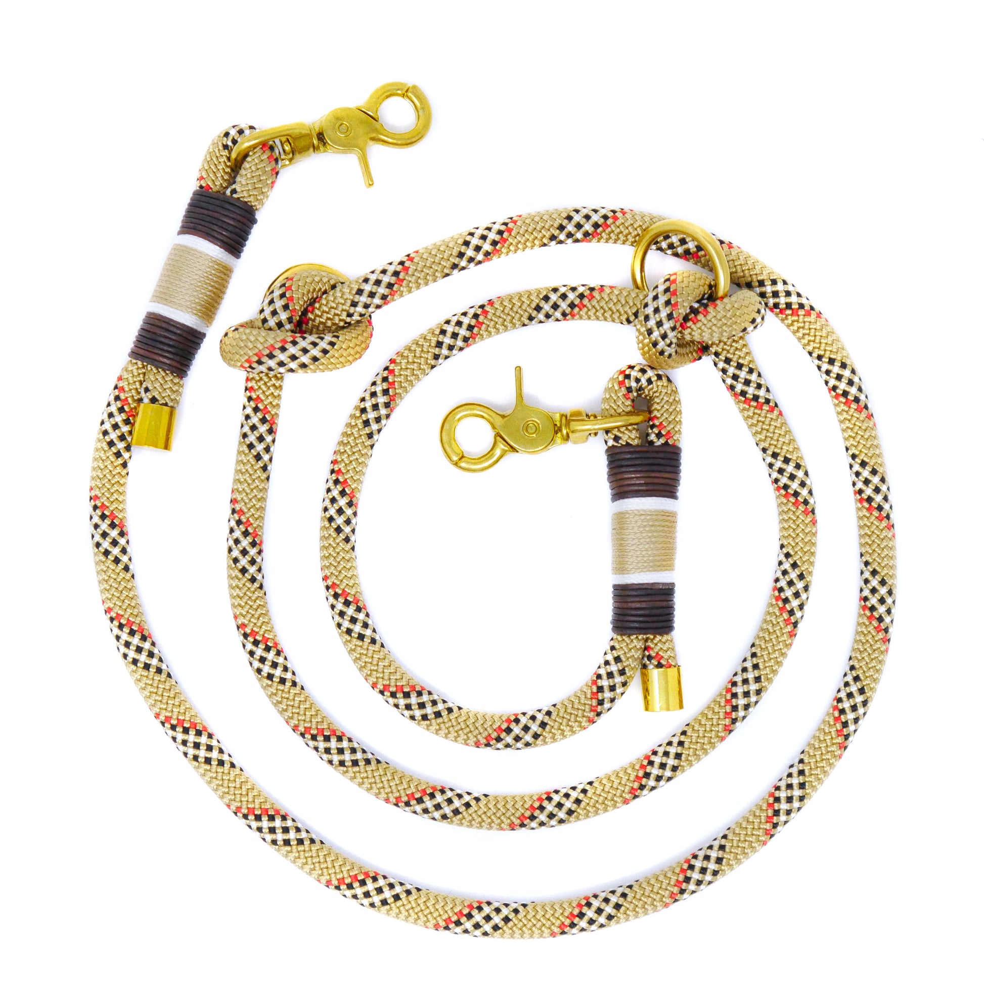 Wetterfeste Tauleine aus Kletterseil. Wahlweise mit zwei Verstellmöglichkeiten oder mit fester Handschlaufe. Diese Leine ist mit goldenen Karabinern ausgestattet.