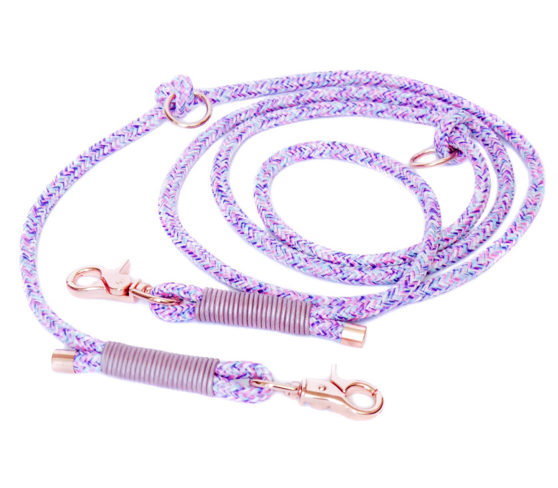 Tauleine aus PPM-Seil (Wetterfest) wahlweise mit zwei Verstellmöglichkeiten oder mit fester Handschlaufe und roségoldenen Karabinern.